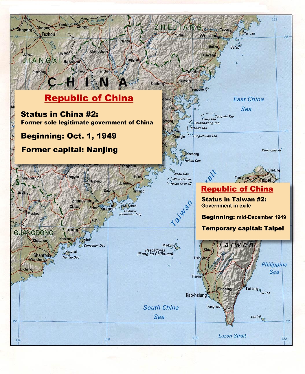 (1) A significant development in the Chinese Civil War occurred in the Fall of 1949, when the People's Republic of China (PRC) announced its founding in Beijing on October 1. (2) With the downfall of the Chinese Nationalist government, the Republic of China in truth could only claim the de facto status of being the former sole legitimate government of China. This we will designate as the ROC's "Status in China #2." (3) At the same time however, the ROC retained its role as a subordinate occupying power in the military occupation of Taiwan. [See graphic #3] |